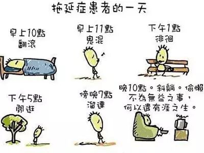 Ø一切自己来:拖延者常常觉得一切事情都应该自己来做,他们认为任何求助都是软弱的标志。他们的压力太大,拖延则变成获得喘息的机会。