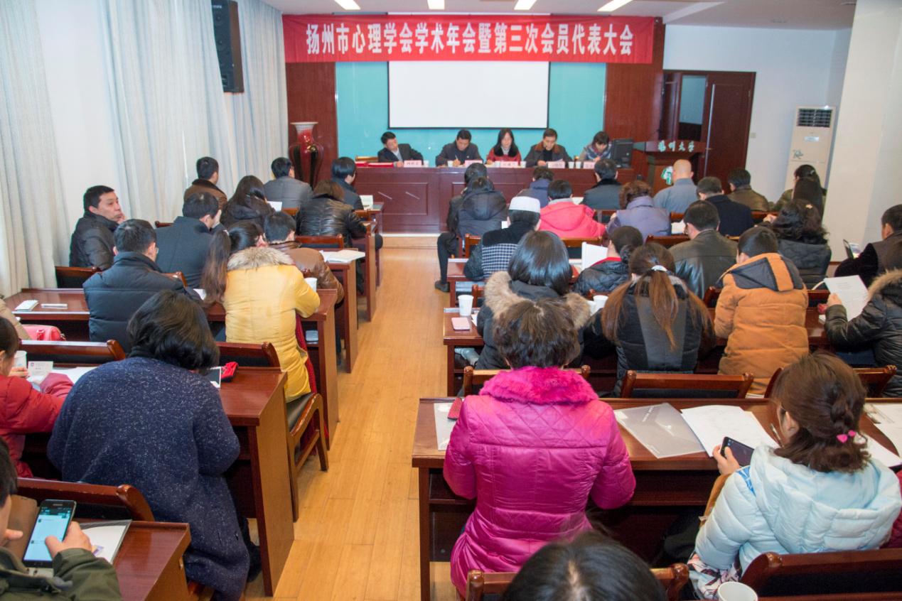 2015年1月25日下午2点,扬州市心理学会在扬州大学瘦西湖校区教科院行政楼二楼报告厅召开了2014年学术年会暨第三次会员代表大会。来自扬州全市的心理学会会员代表共有118人出席了本次大会,扬州市科协学会部方晓平部长、冯晓群副部长莅临大会指导。大会由市心理学会秘书长何桂宏主持,会议的主要议题包括学会换届选举、学术报告、以及新一届理事长会议。