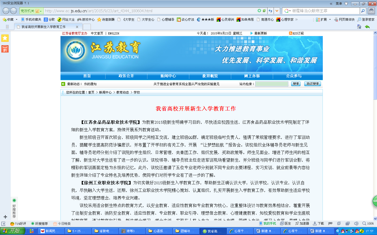 江苏教育网报道了我院新生六个一工程