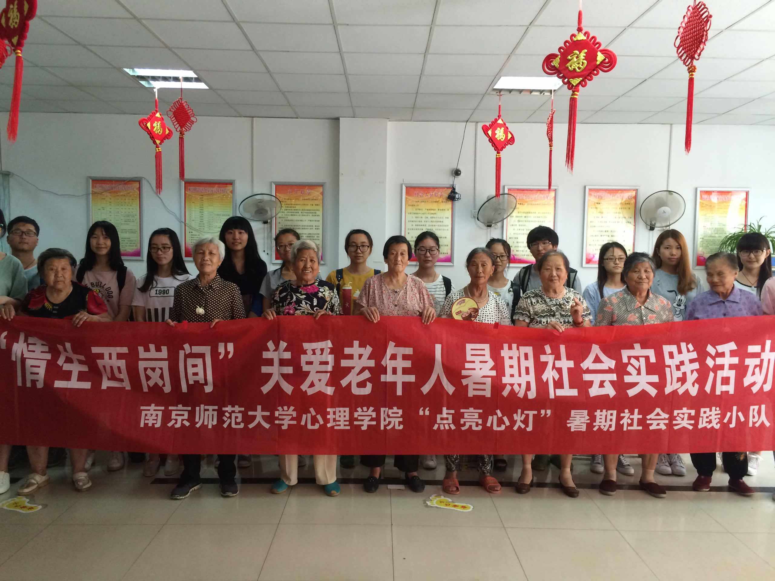 以关爱失独老人心理健康为主题,南京师范大学心理学院“点亮心灯”暑期社会实践小队于2016年7月8日至7月10日,在西岗街道开展了关爱失独老人的活动。志愿者们用耐心持久的陪伴、专业细微的关怀,通过广场活动、问卷调查、心理沙盘、联谊会等丰富多彩的形式,为“失独”家庭解心结、点心灯。