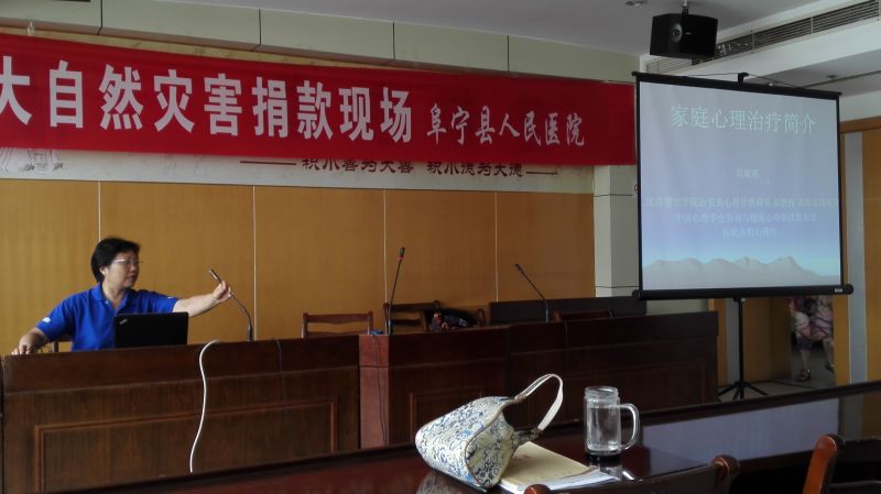 7月19日上午,周朝英和闵霈飞老师在孔荡村继续开展宣传工作,回访一例,新干预一例目睹风灾的村民。下午应阜宁县人民医院的邀请,周朝英老师为医院护理工作者开展了《家庭心理治疗简介》的讲座,深受大家的欢迎。