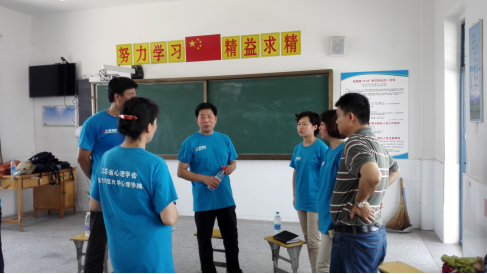 上午,志愿者团队分成两组,一组志愿者们对硕集镇玲玲(化名)、玲玲奶奶以及安置点某村民进行了回访,另一组志愿者来到硕集中心小学安置点为下午的团辅做准备工作。江苏省心理学会副理事长、南京师范大学心理学院副院长邓铸老师,心理学院党委副书记王惠老师当天从南京驱车赶到安置点,对第三批志愿者的活动进行业务指导和慰问,并为志愿者们带来了防暑降温物品,为志愿者提供更加便利的工作条件。在对志愿者团队目前的工作现状进行了充分调研和了解之后,邓老师表示,目前心理援助的工作,宜结合实际作适当调整,可从应急期转入过渡期。村民的情绪以及生活现状较之前有了较大的转变,我们要据此适当调整当前的工作思路,以便更加高效地为灾区人民提供心理援助服务。此外,邓老师还重点对风灾后被父母带离灾区,未能及时接受心理援助服务的这部分学生,在九月份中小学开学后如何稳定、持续、有效的开展心理援助工作,提出很多工作思路和具体设想,如建立相对稳定的工作地点,开展全面的普查和筛查工作,对中小学教师团队开展普及性的心理健康教育培训等。