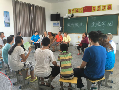 下午,南京医科大学工会调研员王丽雅老师主持的团辅活动准时开展,共计25位村民参加。本次团体辅导的主题是“倾听彼此,重建家园”,旨在帮助村民彼此相识、提供支持、增强互助、表达情绪,以更好的心态投入到灾后重建当中。活动最后,王老师代表志愿者们向不顾炎热、全心投入的参与人员表达了最真挚的感谢与祝福。