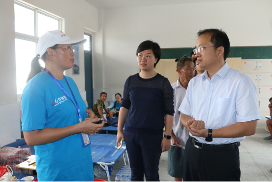 8月3日,由中国矿业大学心理健康中心李红娇老师带领的江苏省心理学会“盐城.心在行动”第四批志愿者,在阜宁开展了第七天的心理援助工作。期间,团江苏省委副书记司勇一行专程赴志愿者工作地点——硕集中心小学安置点慰问志愿者团队。