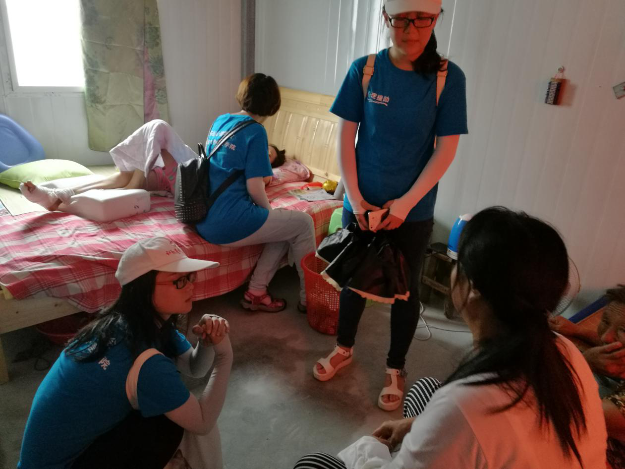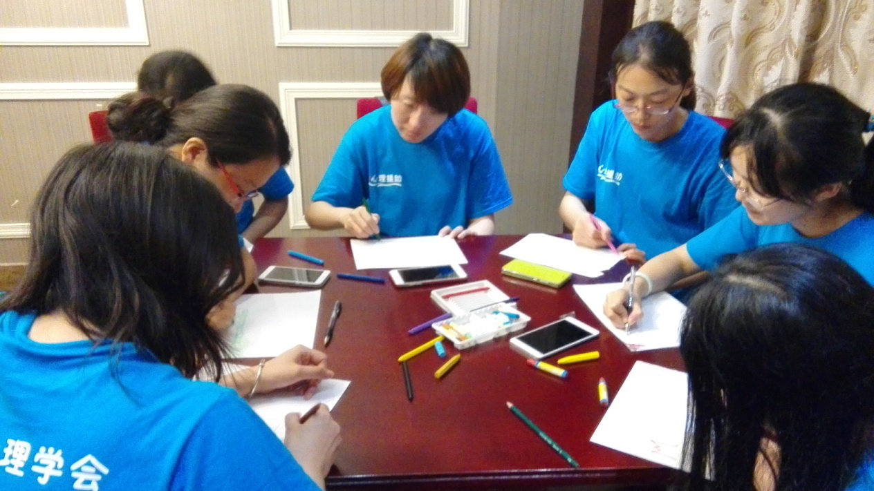 晚上,志愿者们在董丹辉老师的带领下进行了当日工作总结与讨论,并进行了团队建设。会上首先安排了次日的工作,其次处理了一些志愿者在工作过程中遇到的困惑,再次讨论后期可能会采取系统脱敏、放松训练等技术进行过个案的处理,最后分享交流个案小华的一些情况,借此全体志愿者学习了雨景绘画测验的一般流程,便于后期志愿工作中使用。