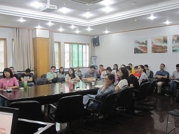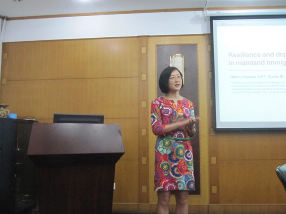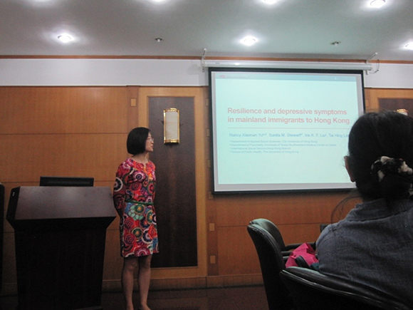 在讲座中,于肖楠博士介绍了她们这一实证研究的整个流程。主要针对香港移民这一特殊人群,详细论述了从验证性心理韧性的保护作用、新移民的需要评估,到心理干预项目的设计和实施,都有一套系统而完整的研究方案。随后于肖楠博士分享了部分研究案例,对心理干预的有效性评估及其背后的机制进行了深入的探讨,引起在场师生极大的参与热情。在分享报告结束后,于老师也对香港城市大学的硕士、博士招生做了一个系统的介绍,并欢迎我省同学就香港进一步深造学习。