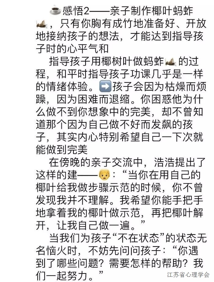 用椰叶编制蚂蚱,这种传统的有海南特色的手工活,对家长和孩子都是新鲜事。爸爸妈妈先学会编制,然后再教孩子,爸爸妈妈是有准备而来的,那又该如何指导孩子呢?少不了演示、少不了讲解,更少不了分解步骤——让孩子看明白,少不了接受提问——让孩子想明白,少不了控制情绪接受错误——让孩子在尝试错误中自己发现问题、找到规律、体验成就感。