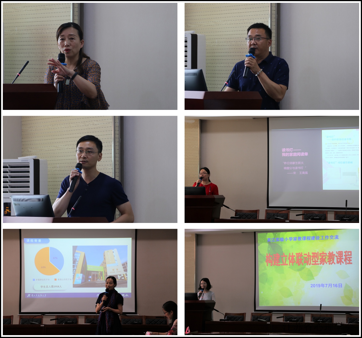 会议第二阶段是各试点学校校长汇报近些年家庭教育的进展和困惑,研讨会由教育局德育处处长徐洁主持。首先汇报的是张家港实验小学,该学校推出“最好是教养”的家校联动计划,从阅读、习惯和个性为抓手开展家庭教育,同时抛出部分家长重智育轻德育的教育困惑。第二位汇报的是常熟市石梅小学,汇报主题为“致力资源开发、推进家校共育”,该校通过构建平台、开发资源、培训研讨等方法传播家庭教育新理念、家校共育新途径、提升家校协同合作力。第三位是太仓市沙溪实验中学的负责人,从家庭教育系统化、课程化角度,搭建连心桥平台,探索新型模式,提高家庭教育的工作效能。第四位来自昆山市新镇中心小学校,新镇中心小学通过调研家长教育模式的差异来探索家校合作的优势方式,划分自经验成长阶段和他经验互助阶段,构建“一家一课程”体系,深度挖掘每个家长教育潜力,并提出反思。第五位汇报的是吴江实验小学,该校着力打造爱德父母学堂,包括普适性、个性化、志愿者、经验型等课程,为家长提供丰富的学习内容。第六位是南京师范大学附属石湖中学,校长分享了该校的家庭教育的理念和举措,坚持问题导向和价值引领,加强提升队伍建设和课程建设等内容。