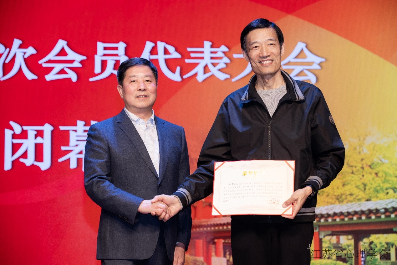 闭幕式第二项会议大会即对在江苏省心理学会第十二届理事会任期内做出贡献的且不再担任新一届理事会、监事会成员的专家进行表彰,颁发“荣誉理事”证书。另外,傅宏教授长期担任江苏省心理学会的领导工作,曾先后任江苏省心理学会理事长、监事会主席等职。经江苏省心理学会第十三届理事会研究决定,授予其“名誉理事长”称号。