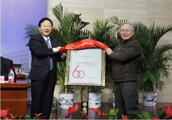 正值江苏省心理学会成立60年,开幕式上还举行了《江苏省心理学会60年》发布式,中国心理学会副理事长、华南师范大学副校长莫雷教授与江苏省心理学会名誉理事长、南京师范大学心理学院郭亨杰教授共同为《江苏省心理学会60年》一书发行揭幕。